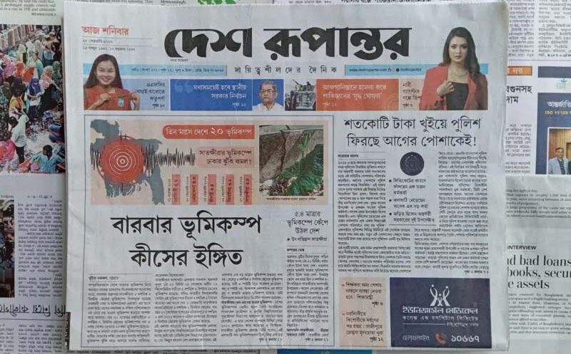 প্রথম আলোর প্রথম পাতার একটি খবর— দেশে ১৩ মাসে ৩২ ভূমিকম্প, উৎপত্তি কম ঝুঁকির অঞ্চলেও।
