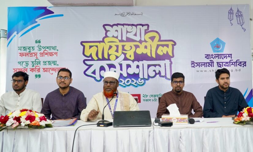 বাংলাদেশ ইসলামী ছাত্রশিবিরের উদ্যোগে দিনব্যাপী ‘শাখা দায়িত্বশীল কর্মশালা ২০২৬’ অনুষ্ঠিত হয়েছে। ছাত্রশিবিরের সেক্রেটারি জেনারেল সিবগাতুল্লাহ সিবগার সঞ্চালনায় এবং কেন্দ্রীয় সভাপতি নূরুল ইসলাম সাদ্দামের সভাপতিত্বে অনুষ্ঠিত কর্মশালায় সারা দেশের শাখা দায়িত্বশীলরা অংশগ্রহণ করেন।