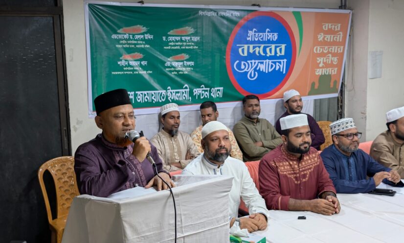 শনিবার (০৭ মার্চ) বাংলাদেশ জামায়াতে ইসলামী পল্টন থানার উদ্যোগে ঐতিহাসিক বদর দিবসের আলোচনা সভায় প্রধান অতিথির বক্তব্যে তিনি এসব কথা বলেন। এসময় তিনি আরও বলেন বদর যুদ্ধের শিক্ষা হচ্ছে সংখ্যা বা অস্ত্রের চেয়ে ঈমান, ধৈর্য এবং আল্লাহর ওপর অঘাত বিশ্বাসই বিজয়ের চাবিকাঠি। বদর যুদ্ধে মুসলমানদের বিজয়ের চিত্র তুলে ধরে তিনি বলেন, মহানবী (সা.) এর নেতৃত্বে মুসলমানদের সৈনিক ছিল মাত্র ৩১৩ জন। অন্য দিকে আবু জাহেলের নেতৃত্বে কুরাইশদের সৈন্য ছিল সহস্রাধিক। কিন্তু বদর যুদ্ধে মুসলমানদের বিজয় অর্জিত হয়। কারণ মুসলমানদের মধ্যে ছিল ঈমানী শক্তি, ধৈর্য এবং এক আল্লাহর প্রতি অঘাত বিশ্বাস ও আস্থা। ইসলামী কল্যাণ রাষ্ট্র প্রতিষ্ঠায় বদর যুদ্ধ থেকে শিক্ষা নিতে তিনি উপস্থিত সকলের প্রতি আহ্বান জানিয়ে বলেন, চব্বিশের ৫ আগস্ট ফ্যাসিবাদের পতনের মাধ্যমে প্রাথমিক বিজয় হলেও চূড়ান্ত বিজয় অর্জিত হয়নি। চূড়ান্ত বিজয়ের জন্য দেশপ্রেমিক সকল ছাত্র-জনতাকে প্রস্তুত ও সজাগ থাকতে হবে।