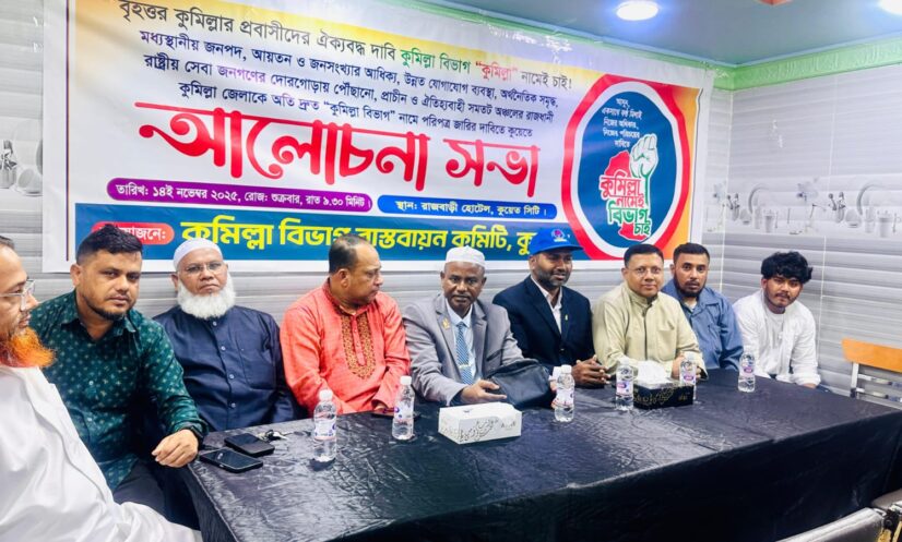 কুয়েত থেকে (আমির হোসাইন মজুমদার)|- গত ১৪ ই নভেম্বর ২০২৫ কুয়েত সিটির রাজবাড়ী হোটেলে কুমিল্লা বিভাগ বাস্তবায়ন কমিটির আয়োজনে দ্রুত “কুমিল্লা বিভাগ” নামে পরিপত্র জারিপূর্বক প্রশাসনিক কার্যক্রম ঘোষণার দাবিতে বিরাট আলোচনা সভা অনুষ্ঠিত হয়েছে।
