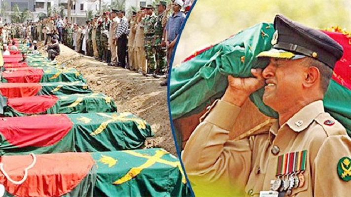 শহীদ সেনা সদস্যদের কফিন এবং কফিন কঁধে কান্নারত একজন সেনাকর্মকর্তা ফাইল ছবি