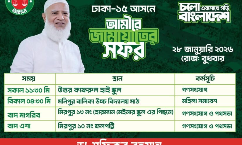 ঢাকা-১৫ আসনে আজ ২৮ জানুয়ারি (বুধবার) সম্মানিত আমীরে জামায়াত ডা. শফিকুর রহমান এর নির্বাচনী সফর।